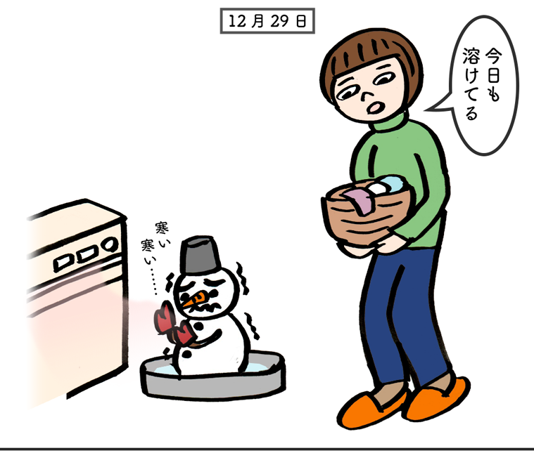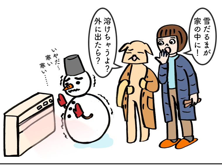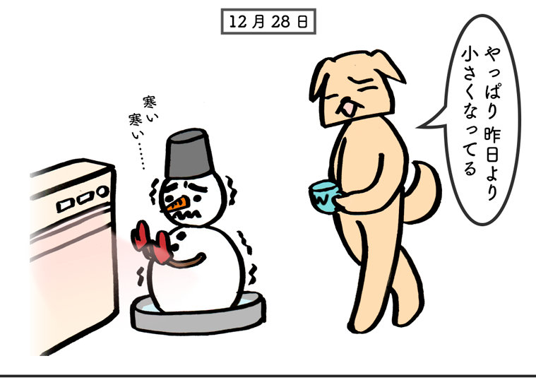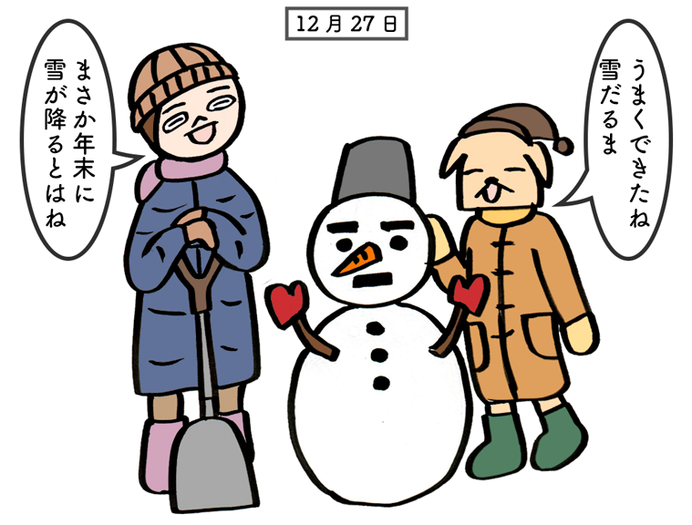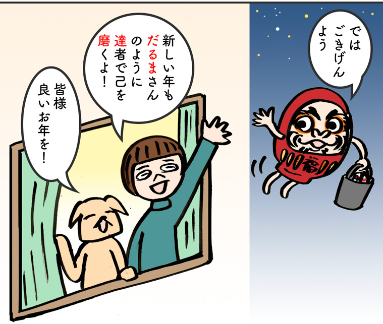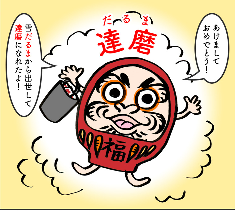 雪だるま、かわいい! でも溶けちゃうの? と思いきや、大迫力の達磨さんに変身するという、来年が楽しみになる縁起の良い出世話。おめでたい四字熟語も満載で円満具足。私も達者で己を磨かねば、と決意したところであなたも私もさっそく「達磨」が書けるようになって一歩前進ですね。幸先良いぞ〜♪