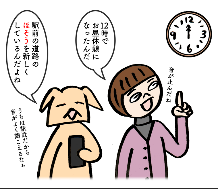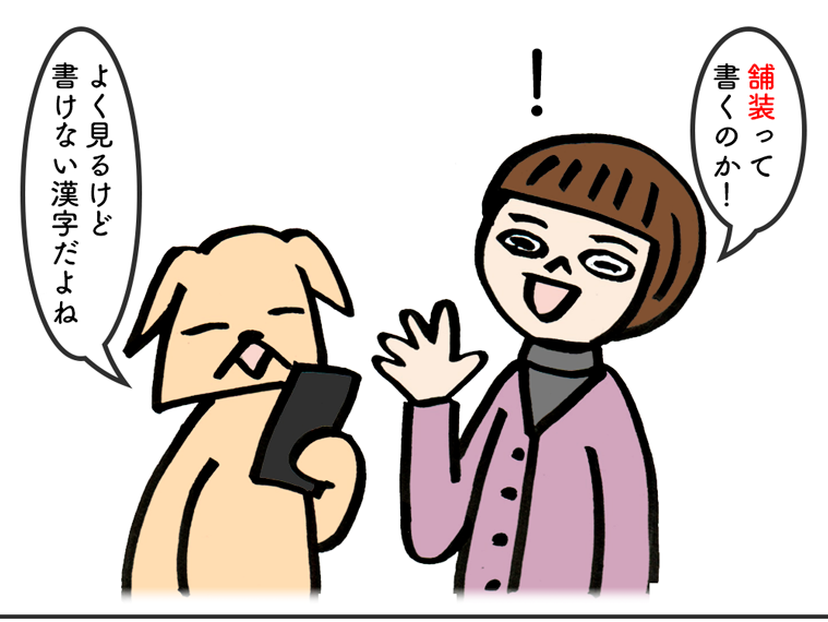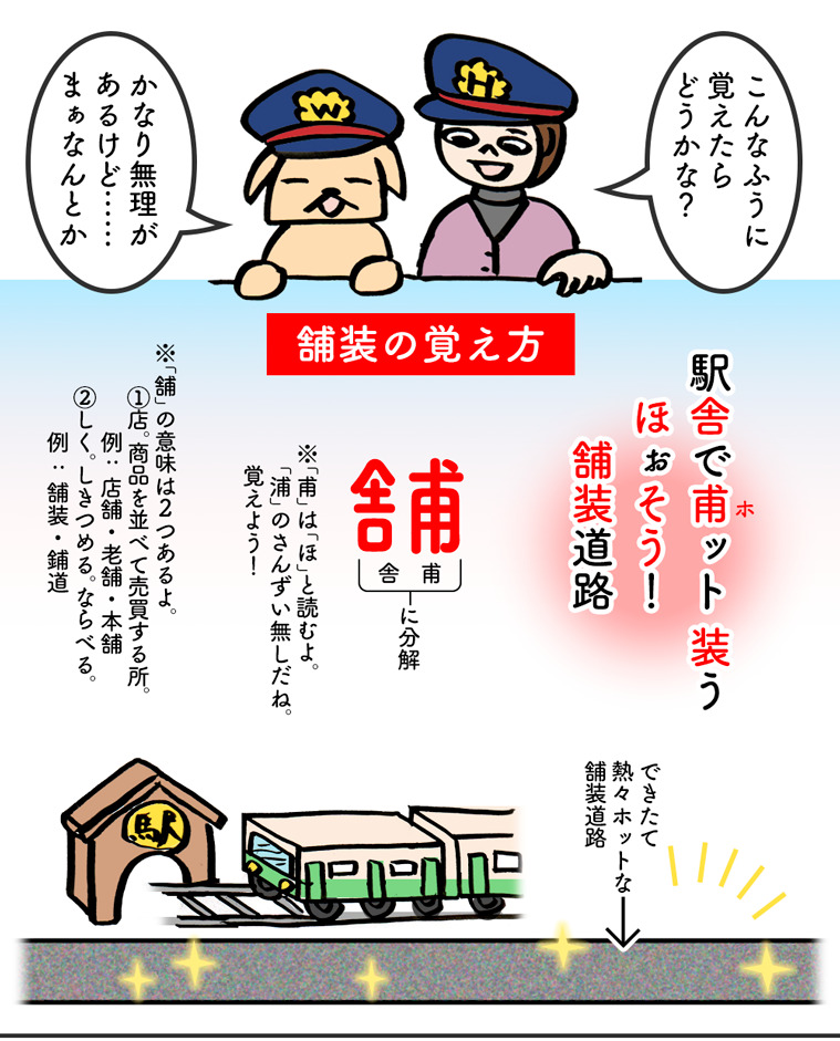 そうそう、「舗装(ほそう)」って、よく見るしちゃんと読めるけど書けない漢字の中でかなりハイランクに違いありません。「甫(ほ)」もわかるようでわからない漢字です。中国の詩人の「杜甫」くらいでしか見ないような……。でも、そんなモヤモヤも今日で卒業、駅舎で甫っと装ってこれでバッチリ。ハト子とワン太の駅員さん帽子の装いもなかなか決まってて Ho! So! あなたも一緒に漢字師匠(マスター)目指してレッツ漢字の勉強!