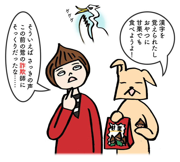 浅羽容子作の漢字漫画「漢字師匠(マスター)への道」、いかがでしたでしょうか? フォトジェニックな鷺の詐欺師、まさかの再登場。そして言うのです、人でなしが作る其れが欠けていると……謎めいていて、物語を感じる言葉です。オレだよオレと言われたら、何かが欠けていないか見極めないといけませんね。今日も甘栗とフェネックギツネハト子とワン太と一緒に、レッツ漢字の勉強! いやはや、人でなしを見極めるの、難しいですけどね。詐欺にはどうぞお気をつけて。