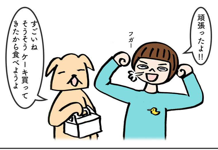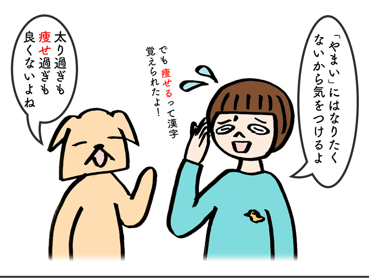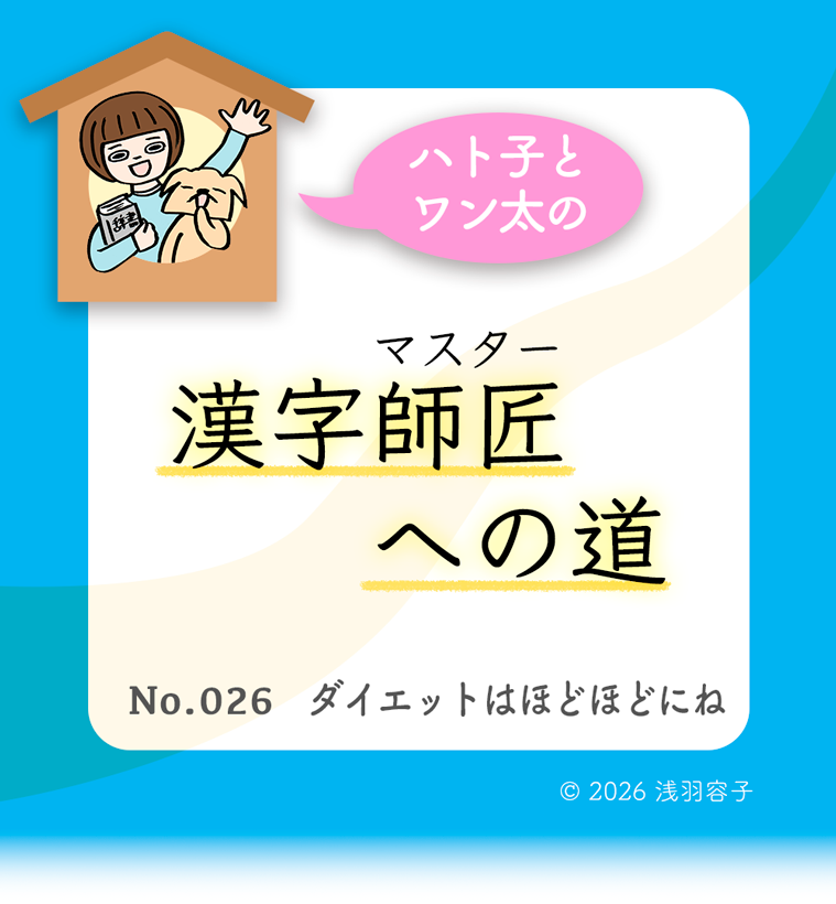 また申すまでケーキをほどほどにたしなんで、ランニングがんばってね。さてあなたも私も、ハト子とワン太と一緒にレッツ漢字の勉強!