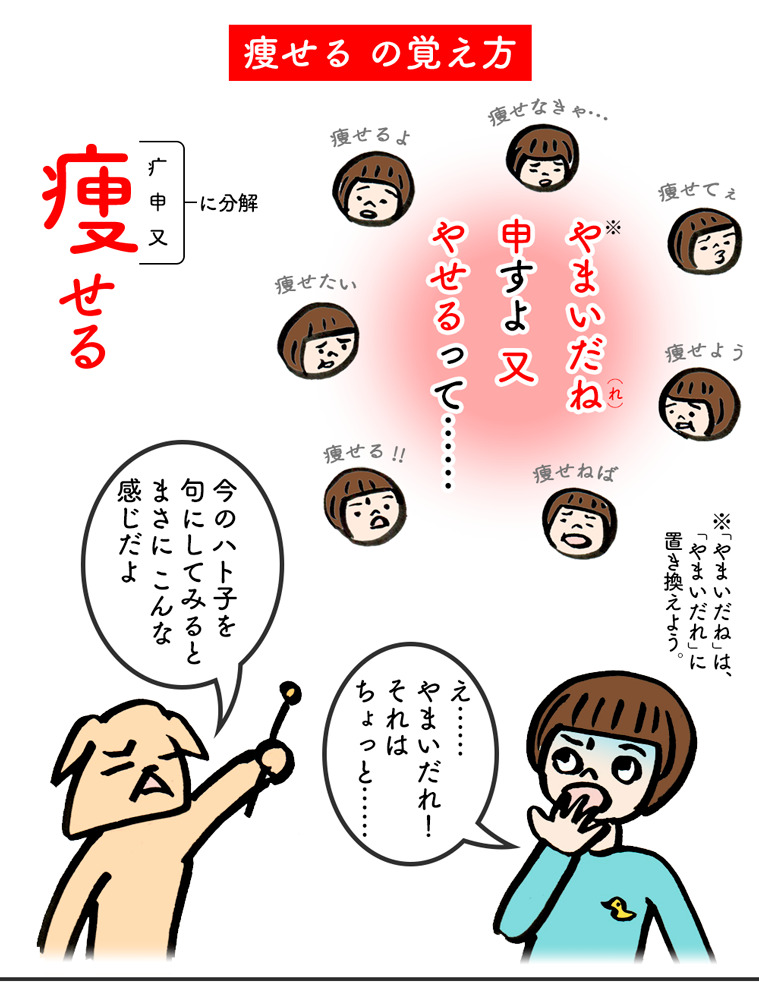痩せるという字は、難しくて書きにくく覚えられないランキング高位の「叟」(そう。老人に対して敬意を込めて指す言葉で能の「三番叟」などに使われる)に似ていませんか。おかげでハードルが超高かったのに、これで一発で覚えられた! はいご唱和ください「やまいだね、もうすよまた痩せるって」