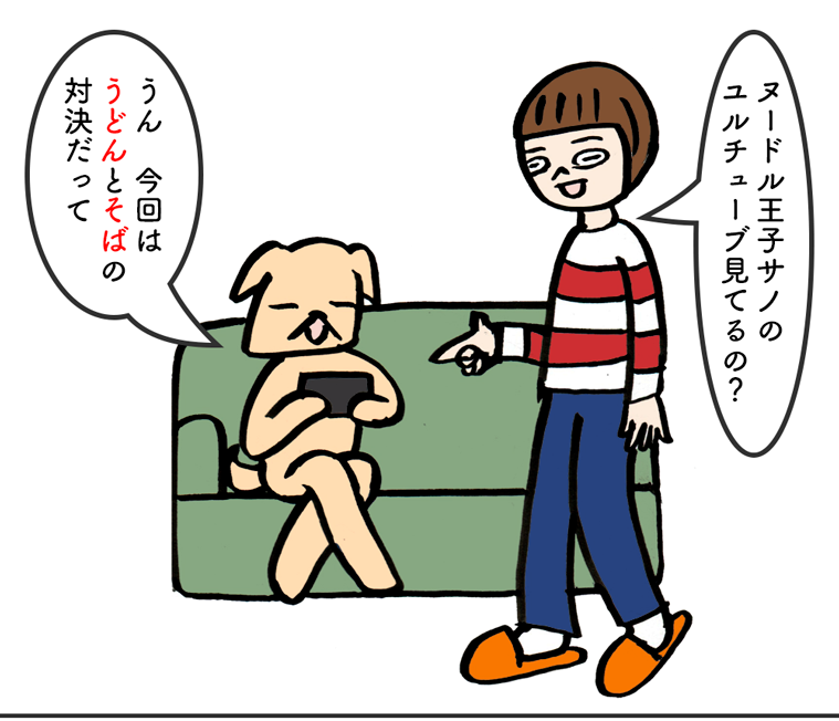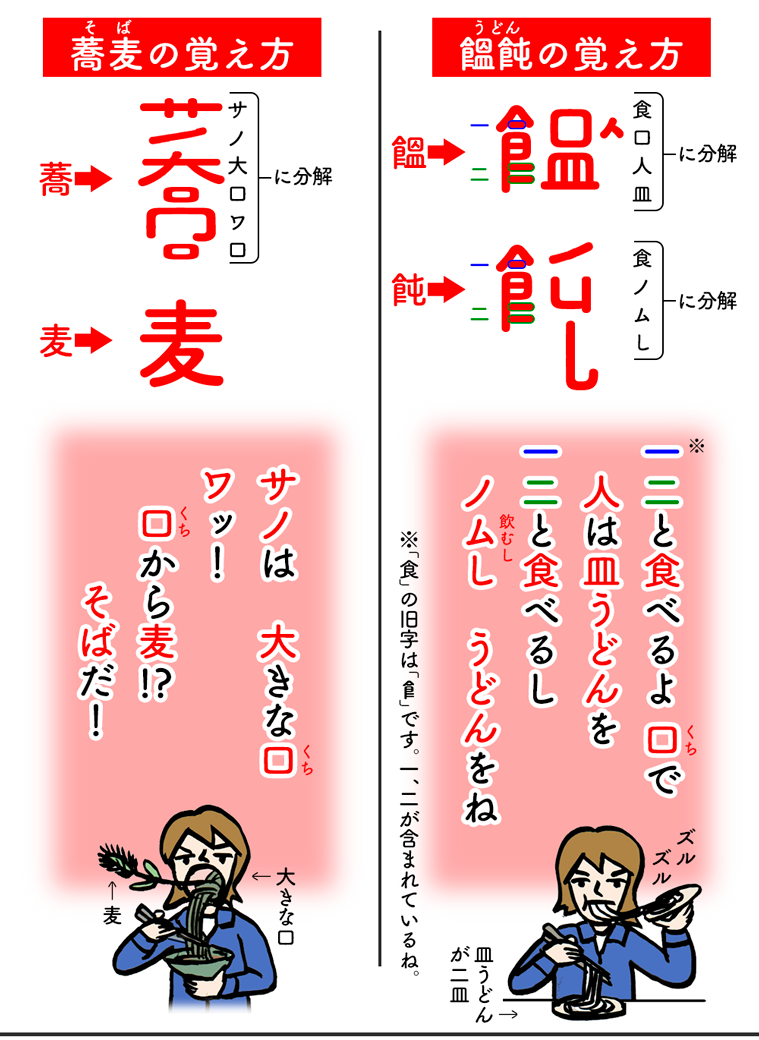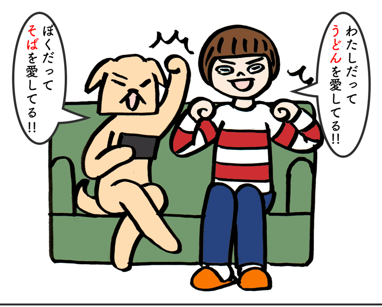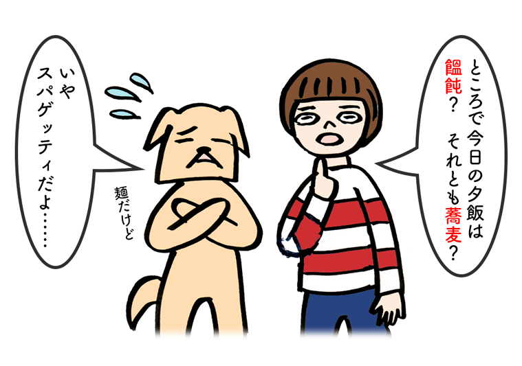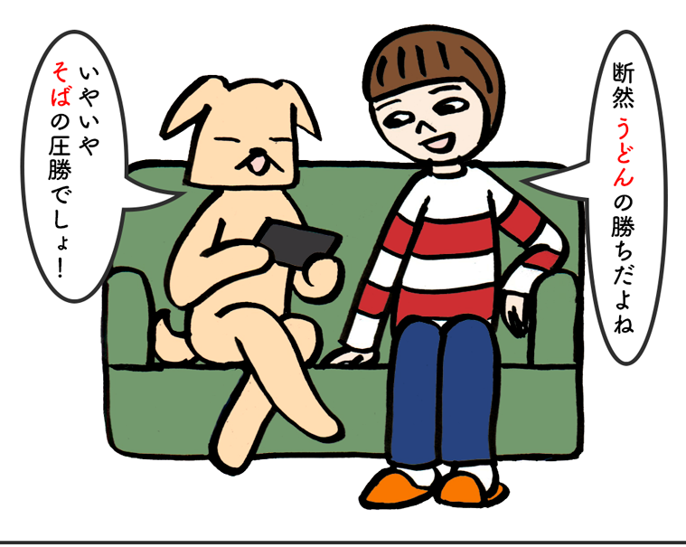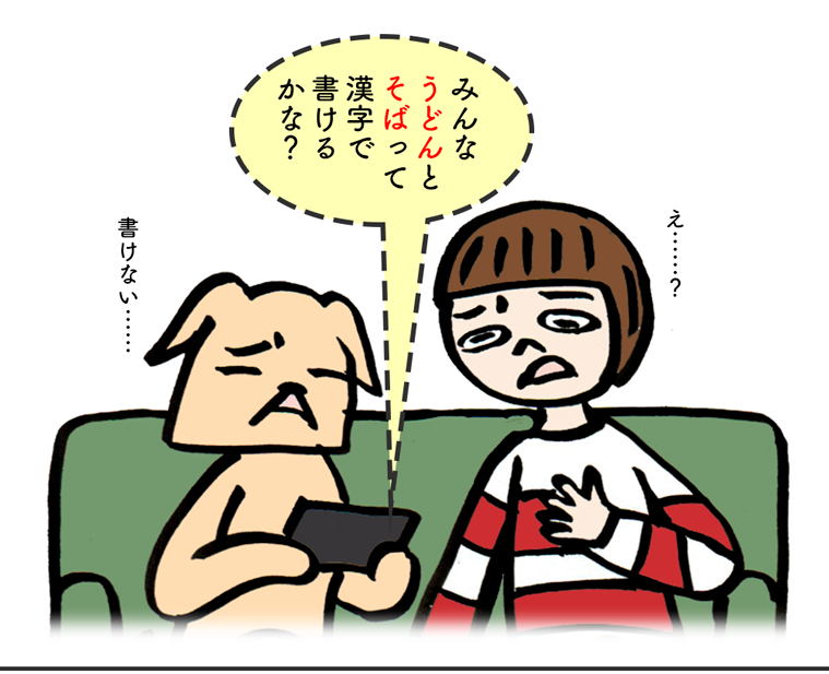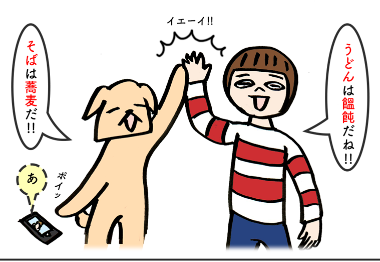 うーん、私はそば派かな? ハト子はうどんなんだ? なんて途中まで呑気に楽しんでましたが、書けない! 全然書けない、うどんもそばも!! と気づいて愕然。日本二大麺の漢字が一気に書けるようになるなんて素晴らしいですね。ヌードル王子のアクロバティックなメン食い光景を目に焼き付けて、これでもう大丈夫。ありがとう、サノ。今日も漢字師匠(マスター)目指して、ハト子とワン太と一緒にレッツ漢字の勉強!