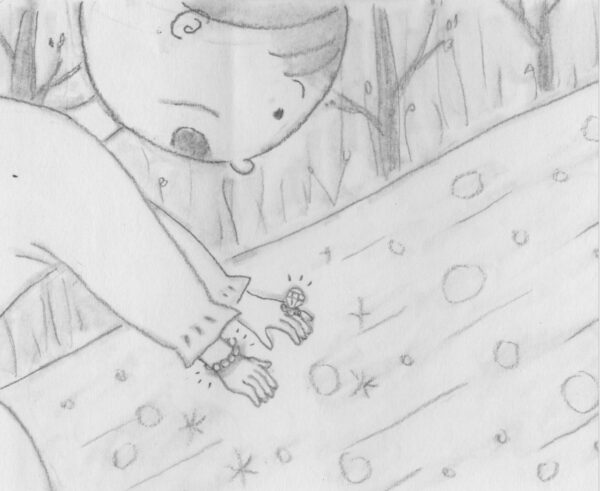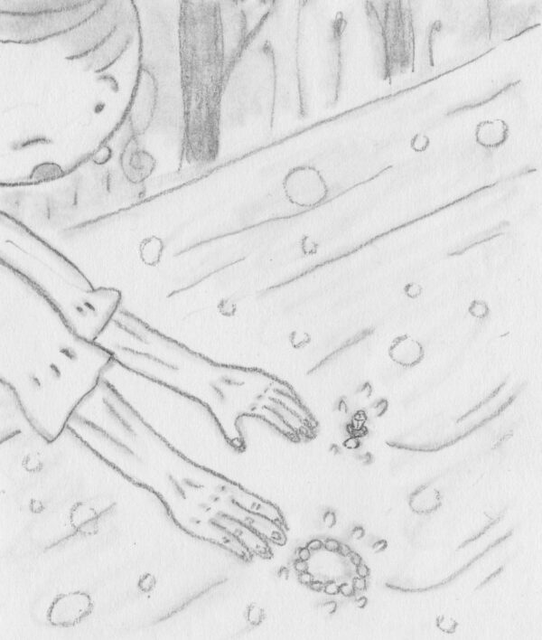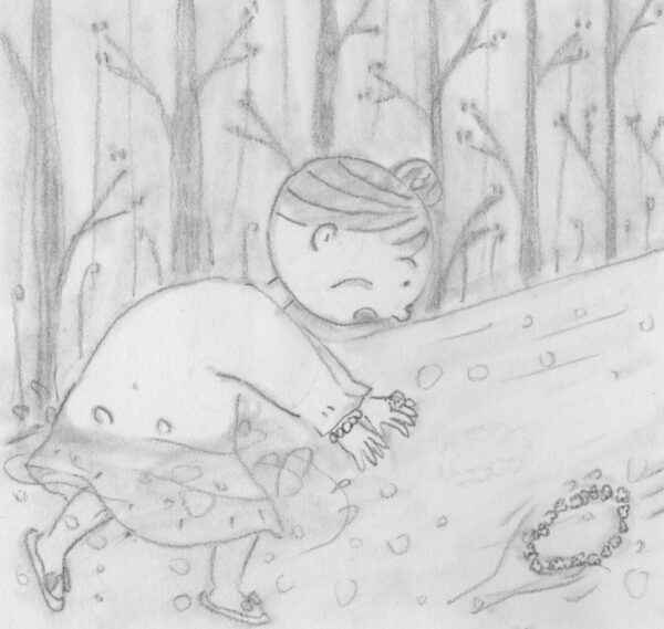 ずっと忘れていた、幼い頃の宝物が川上から流れてきて、「身に着けて」と言わんばかりにお婆さんの方に寄ってきます。お婆さんがそれを身に着けるとだんだん若返ります。