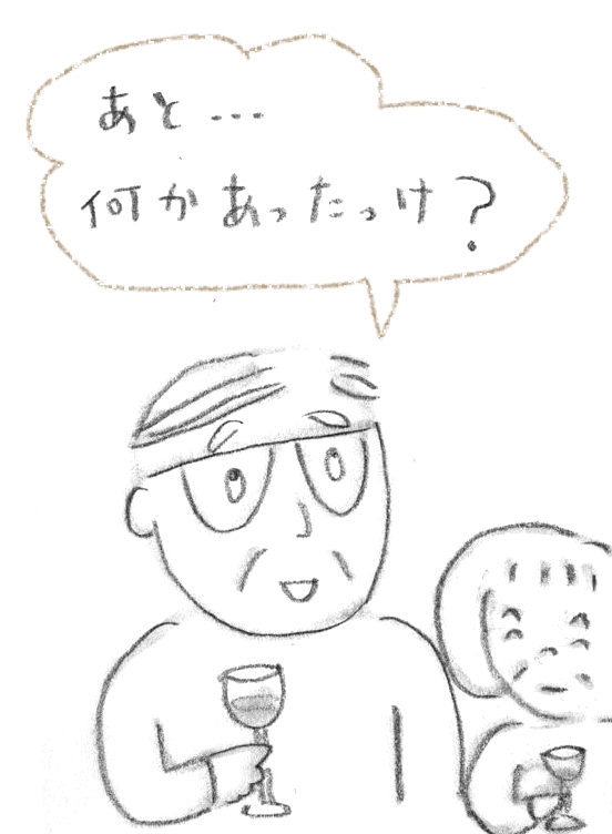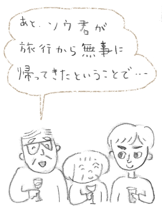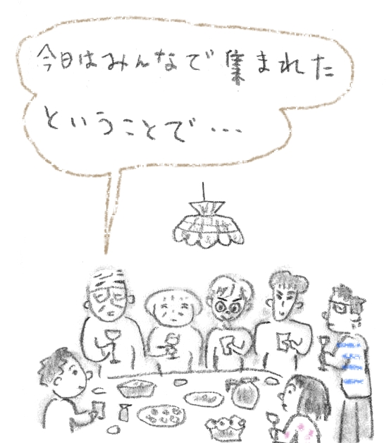 夕方、みんなが集まり、まずは乾杯となり……